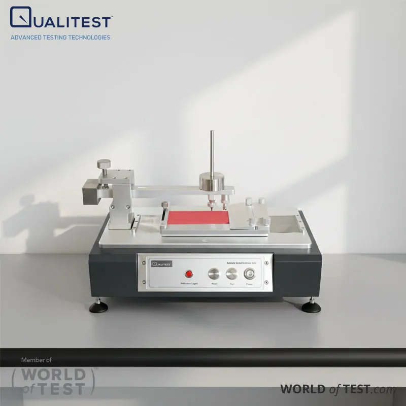 Qualitest propose le testeur automatique de résistance aux rayures en deux variantes CL et VL pour une charge constante et une charge variable, conformes aux dernières normes ISO 1518 et autres normes.